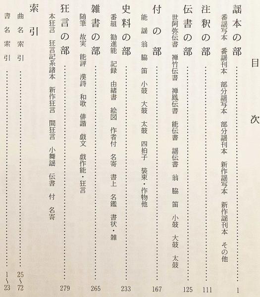 ・伝書の部:世阿弥伝書. 禅竹伝書. 禅鳳伝書. 能伝書. 謡伝書. 翁. 脇. 笛. 小鼓. 大鼓. 太鼓.
