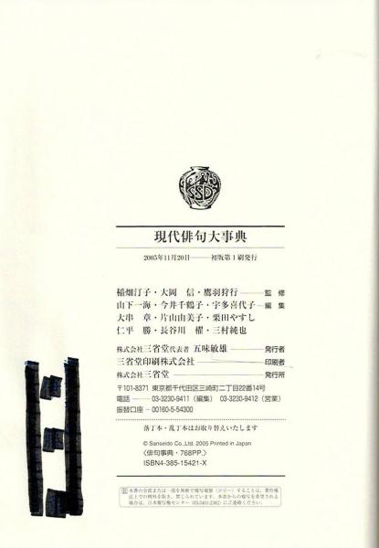 • 著者 稲畑汀子, 大岡信, 鷹羽狩行 監修 ; 山下一海, 今井千鶴子, 宇多喜代子, 大串章, 片山由美子, 栗田やすし, 仁平勝, 長谷川櫂, 三村純也 編