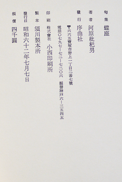 句集 蝶座 河原枇杷男 A5判初版箱美本 序曲社 昭和62年