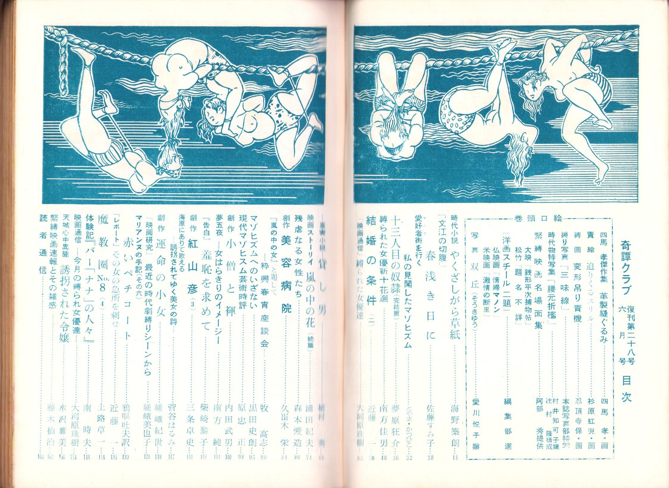 • 著者 〈モデル 村井知可子、愛川悦子〉〈画 四馬孝、杉原虹児、忍頂寺保〉〈佐藤すみ子「春浅き日に -文江の切腹-」4頁〉〈南方純「夢五夜 -女はらきりのイメージ-」2頁〉〈座談会「『嵐の中の女』と題して -粋興春宵座談会-」司会・牧高志 5頁〉、とやま・かづひこ、大河原珠樹、森本愛造、黒田史朗、原忠正、南方純、嵯峨紀世、土路草一