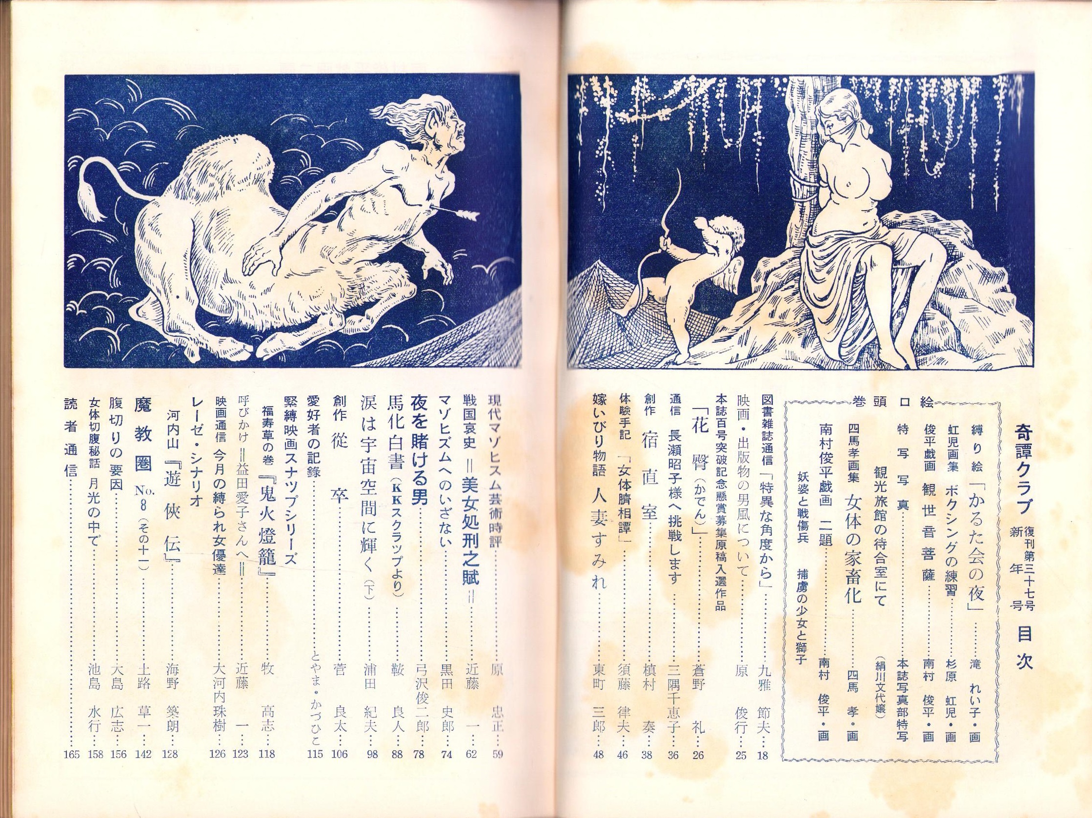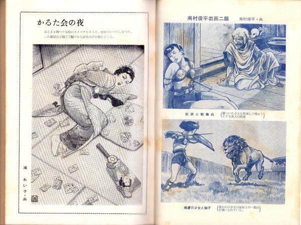 • 著者 〈モデル 絹川文代〉〈画 滝れい子、杉原虹児、南村俊平、四馬孝〉〈牧高志「緊縛映画スナツプリシーズ 福寿草の巻『鬼火燈籠』」5頁〉〈海野築朗「レーゼ・シナリオ 河山内『遊侠伝』」14頁〉〈大島広志「腹切りの要因」1頁〉〈池島水行「女体切腹秘話 月光の中で」4頁〉、九雅節夫、須藤律夫、東町三郎、原忠正、近藤一、黒田史朗、弓沢俊二郎、鞍良人、菅良太、とやま・かづひこ、大河原珠樹、土路草一