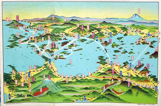 • 解説 鳥瞰図入。沿線名所案内、航路案内、汽船発着時刻表、他。