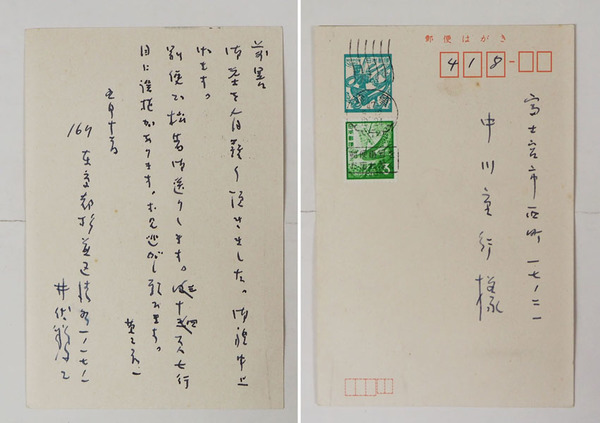井伏鱒二葉書 中川重行宛 ペン書4行 「…七行目に誤植があります。…」