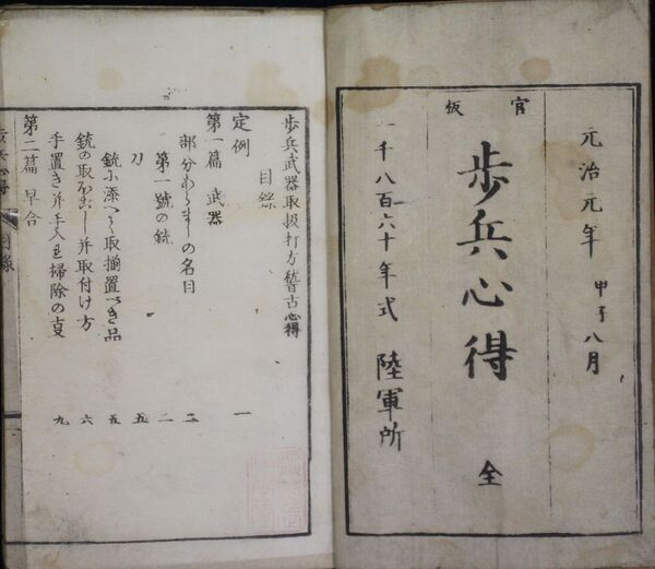 • 解説 元治元年刊 小墨汚・シミ有 歩兵武器の取り扱いや稽古の心得について書かれた軍事書。一八六〇年にオランダで出版された「歩兵射撃術操典」を翻訳し、陸軍所から出版した。訳者大築保太郎は日本おける洋式陸運砲術の先駆者である。