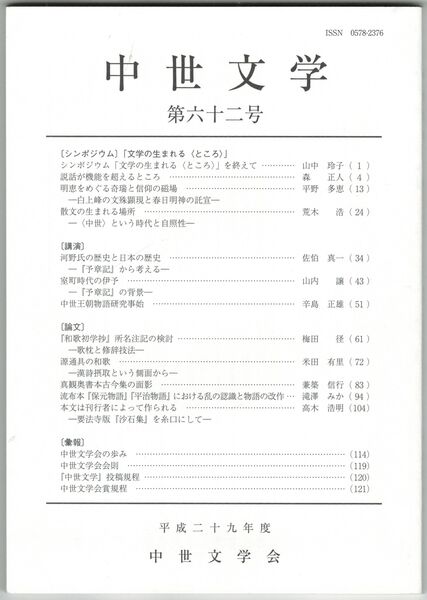 中世文学 62号 「文学の生まれる<ところ>」