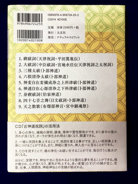 【目次】●祝詞本文 ●解説 ●祝詞奏上 1,序禊祓詞(天津祝詞・平田篤胤伝) 2,大祓詞(中臣祓詞・宮地水位伝天津祝詞之太祝詞) 3,三種太祓(卜部神道) 4,六根清浄太祓(卜部神道) 5,神変自在変穢成浄之上科津祓(卜部神道) 6,神通自在心源清浄之下科津祓(卜部神道) 7,身禊祓詞(伯家神道) 8,四十七音之傳(日文祓詞・ト部神道) 9,天之数歌(布瑠部神言・宮中鎮魂祭)