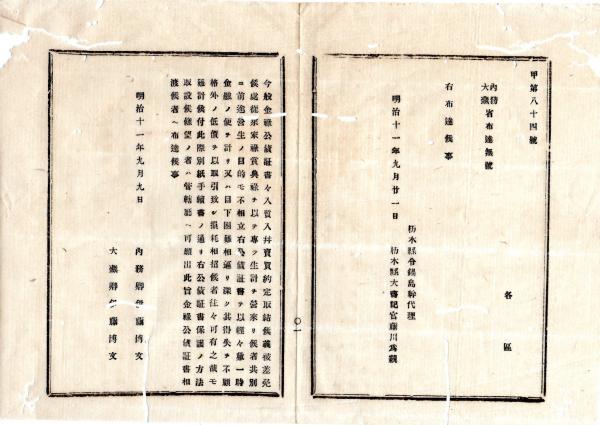 明治布告布達 ○金禄公債証書保護手続書制定 金禄公債証書の質入譲渡解禁に伴い大蔵省が生計困窮者の証書を買上た 内務大蔵両卿連名○明治11年 大蔵省布達 栃木県○和本古書古文書