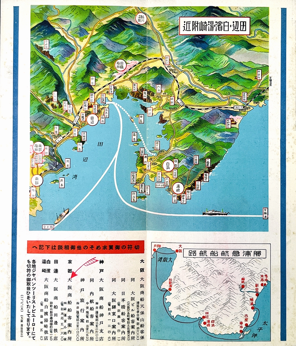 • 解説 鳥瞰図「田辺・白浜・湯崎附近」、写真入り観光案内、他。