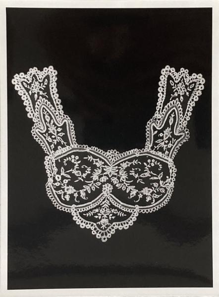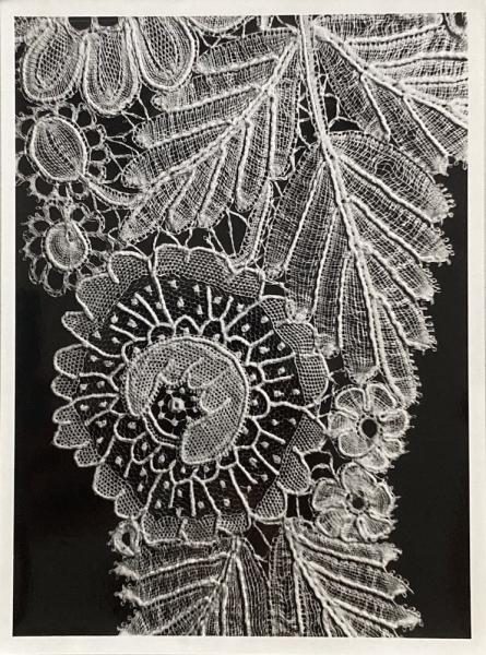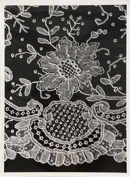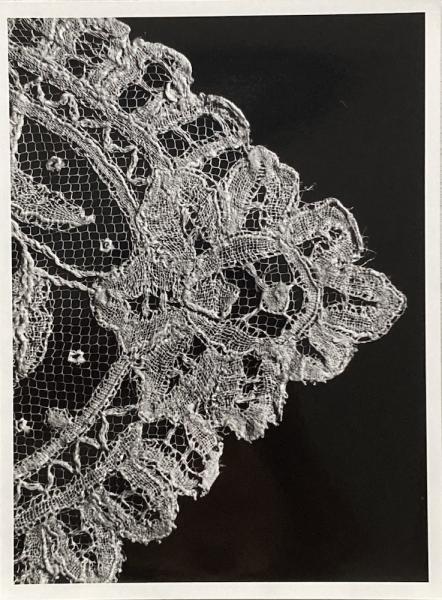 • 解説 17世紀後半から18世紀にかけてベルギーやフランスで作られたと思われるボビンレースなどによるレースの写真。襟飾り、ハンカチ、イニシャルの刺繍など、細部の写真もあり。