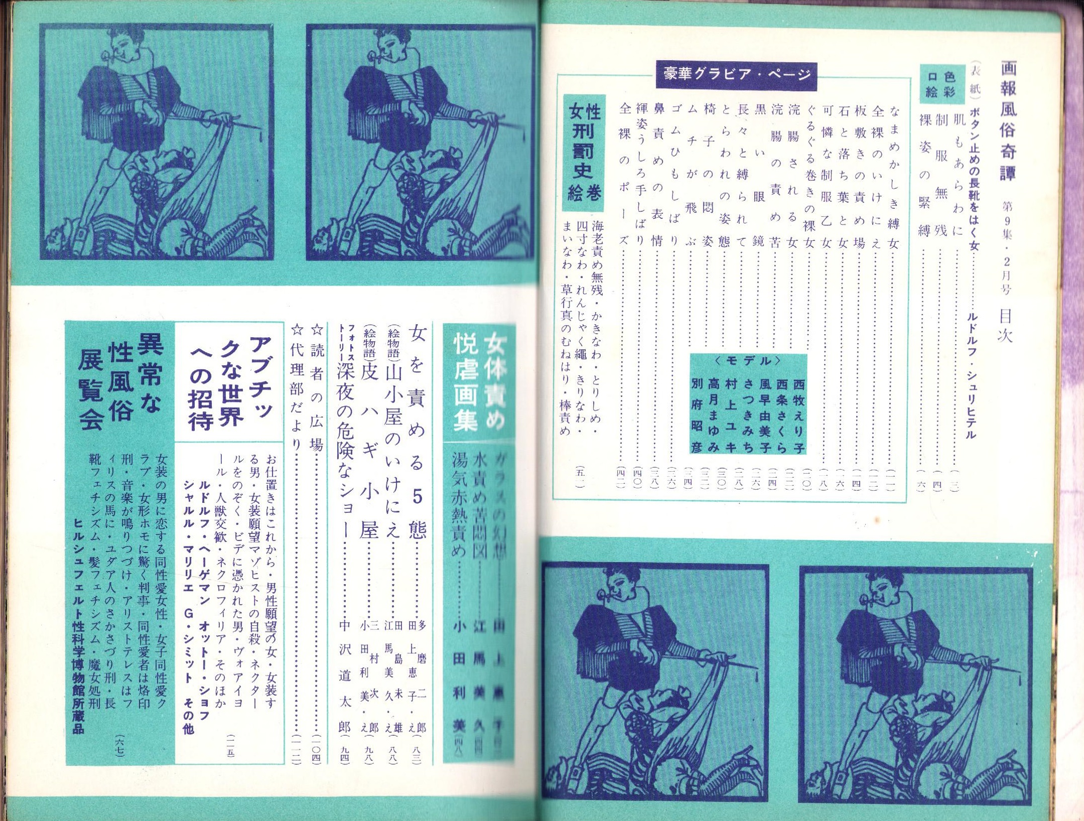 • 著者 〈モデル 西牧えり子、西条さくら、風早由美子、さつきみち、村上ユキ、高月まゆみ〉〈田上恵子、江馬美久、小田利美「女体責め性虐画集」8頁〉〈女性刑罰史絵巻 モノクロ16頁〉〈異常な性風俗展覧会 16頁〉〈多磨二郎・文、田上恵子「女を責める5態」5頁〉〈田島末吉・文、江馬美久・絵「絵物語 山小屋のいけにえ」6頁〉〈三村次郎・文、小田利美・絵「絵物語 皮ハギ小屋」6頁〉〈アブチックな世界への招待 16頁〉、中沢道太郎