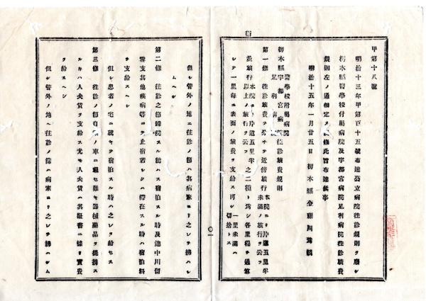 • 解説 N25101150○明治布告布達○栃木県医学校附属病院及宇都宮病院足利病院 往診旅費規則5ヵ条制定 近傍旅行並旅行 管外の取扱○明治15年 栃木県布達○和本古書古文書
