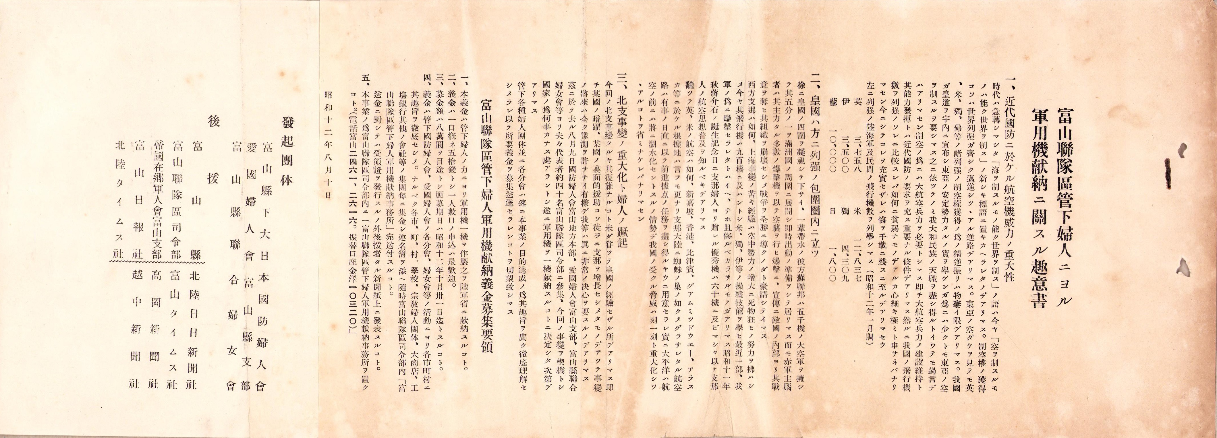 (一枚刷)富山聯隊区管下婦人ニヨル軍用機献納ニ関スル趣意書 -昭和12年-(富山県)