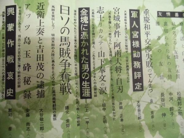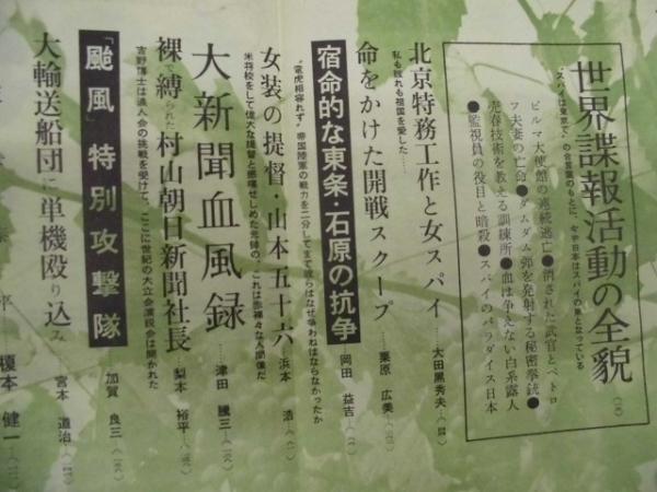 • 著者 「目次」より:・世界諜報活動の全貌 ・北京特務工作と女スパイ ・宿命的な東条・石原の抗争 ・女装の提督・山本五十六 ・「颱風」特別攻撃隊 ・重慶和平交渉失敗のてんまつ ・宮城事件と阿南大将の自刃 ・志士リカルテと山下奉文の涙 ・日ソの馬賊争奪戦 ・アッツ島玉砕秘録 ・興蒙作戦哀史 ほか