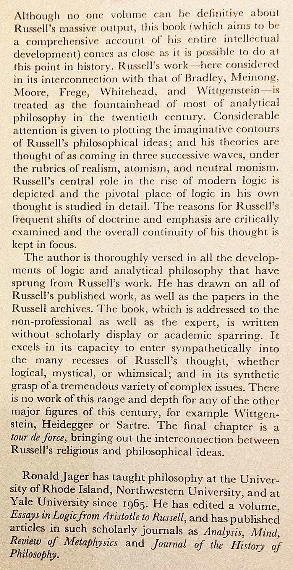 ラッセルの思想の全体像を、初期の形而上学から論理学・言語理論・中立一元論・倫理思想まで体系的に追った一冊。