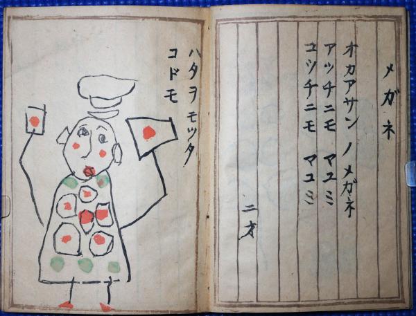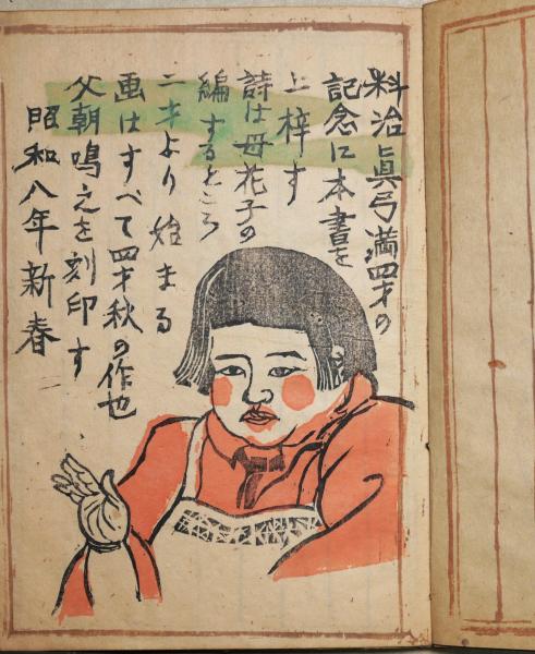 • 解説 見開きに「料治真弓満四斎の記念に本書を上梓す 詩は母花子の編するところ 二才より始まる画はすべて四才秋の作也 父朝鳴之を刻印す 昭和八年新春」と記 表紙少ヤケ