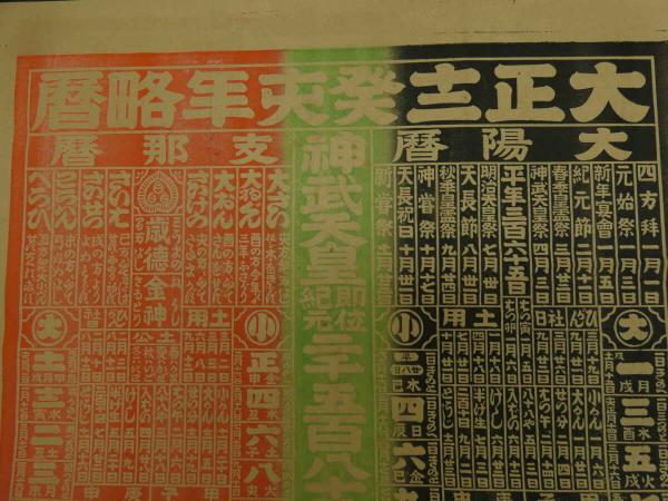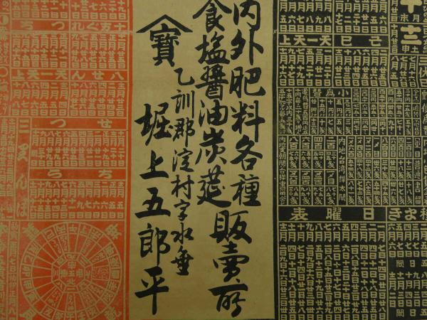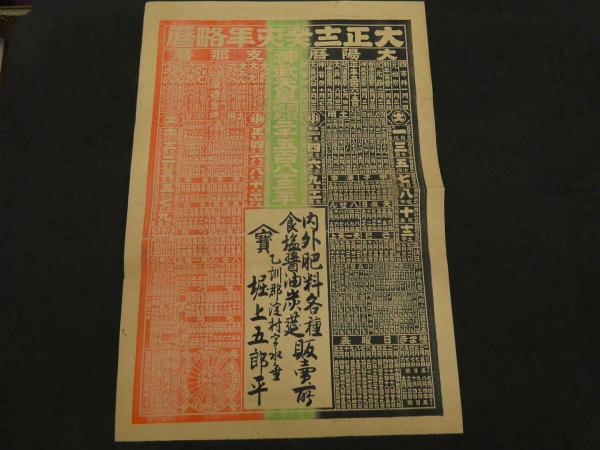 8 5 引札 略暦 大正12年 内外肥料各種 食塩醤油炭莚販売所 乙訓郡淀村 堀上五郎平 石版3色刷 約53×37cm