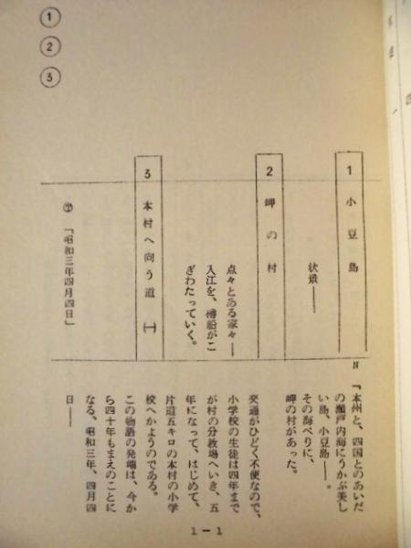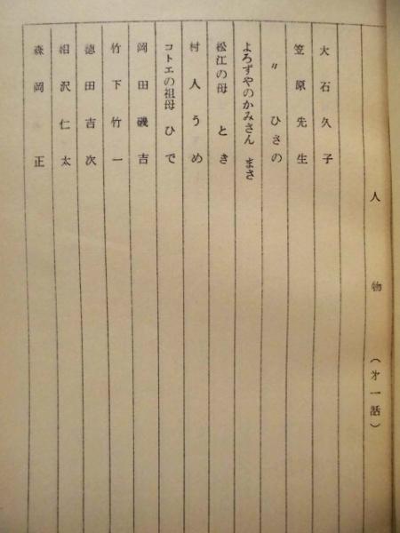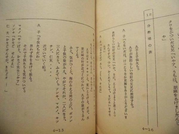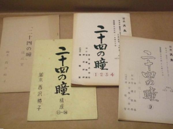 • 解説 4点一括です。 「二十四の瞳 構成案」孔版(ガリ版刷り)、本体のみの冊子、B5判15ページ  「二十四の瞳 構成 11~24」本体のみの冊子、B5判34ページ ※巻末白紙紙面にはメモ書きが入っています。 「二十四の瞳 1・2・3・4」本体のみの冊子、B5判30+29+31+27ページ ※第四話の一部に乱丁(…15-16-13-14…)がありました。 「二十四の瞳 9 改訂」孔版(ガリ版刷り)、本体のみの冊子、B5判36ページ 各、半世紀以上の歳月を経過したものですので、日焼けやスレ、小さなイタミ、一部紙面の角に折れ跡などの劣化があります。 ()内は、データベースよりの転載です。写し間違いや未確認の事項もございますので、予めご承知おきください。