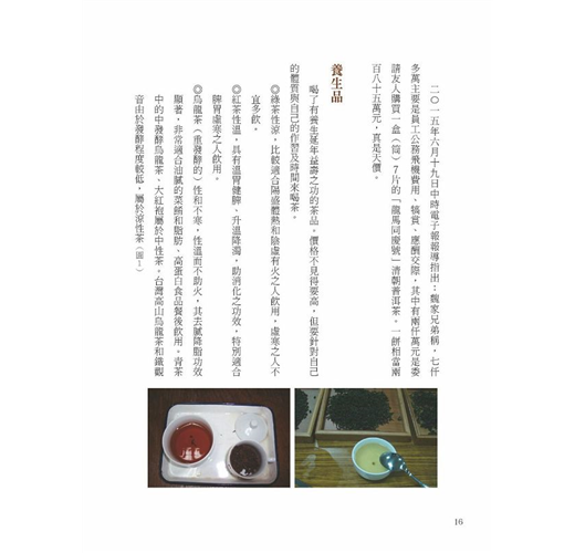 • 解説 國內第一本台湾老茶全攻略。只要一提到老茶,大部份人都會想到普洱茶,其實真正最好的老茶是台灣本土的茶,大部份的老茶是保存在被遺忘的角落……這本書,讓您成為台灣老茶專家。在2007年以前,只有少數人特別是有收藏嗜好者,對老茶還寄以期待並少量收藏觀察轉化,更少數的茶人則視存老茶為保留時光與記憶的滋味。這類如詩人騷客的茶人在喝老茶時總會懷著對歲月的感念與尊重,藉由入口的老韻牽引出品飲一段過往風月,特別是得遇一款轉化趨純的上等老茶……那開啟許多人心中這份心門的鑰匙,或許就會由一杯老茶牽動起。