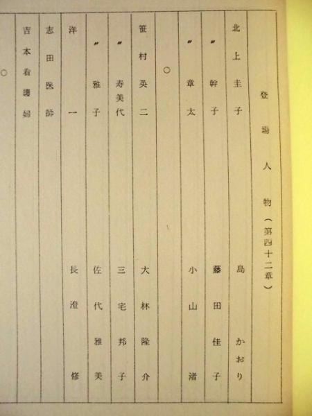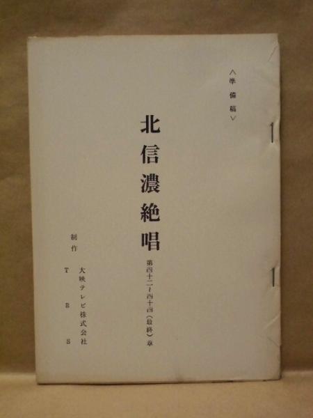 • 著者 北信濃絶唱 第四十二章~第四十四(最終)章 準備稿  放送期間:(1972/01/04~1972/03/03) 放送時間:(13:00-13:30) 制作:大映テレビ株式会社 TBS 作:西沢裕子 出演者:島かおり 藤田佳子 小山渚 大林隆介 三宅邦子 佐代雅美 長澄修 川合伸旺