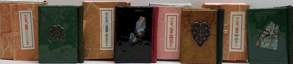 • 解説 各冊背革レリーフ嵌込光沢表紙 和紙四方タトウ付 4×3