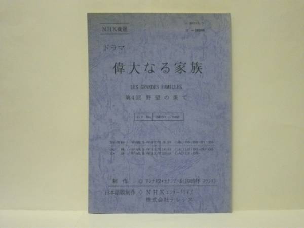 • 著者 NHK衛生 ドラマ 偉大なる家族 第4回 野望の果て  放送日:1993年12月3日 制作:アンテヌ2・テクニソール(1989年フランス) 日本語版製作:NHKエンタープライズ 株式会社テレシス 翻訳:深沢三子 演出:好川阿津志 キャスト(声):菅生隆之 北町嘉朗 野沢由香里 水野龍司 篠倉伸子 大塚周夫 納谷六朗 幸田奈穂子 今井和子 石森達幸 松岡文雄 千田光男 岸野一彦 小林勝也 大木民夫 益富信孝 藤本譲 仁内建之 三木敏彦 大山高男 石丸博也 小宮和枝 北村弘一 北川勝博 丸山詠二 好村俊子 林秀樹 宮寺智子 糸博 檀臣幸 村治学 金内喜久夫