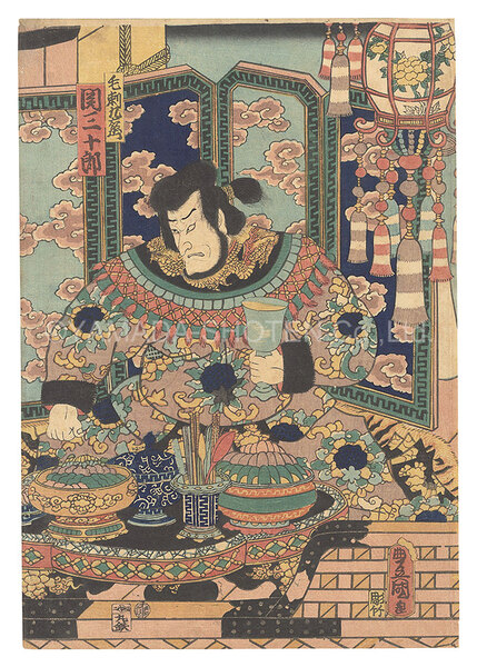 • 解説 Woodblock Print大判1枚摺良 トリミング 少ヤケ 少傷ミ 端部折レ 裏面貼付剥がし跡 ※3枚続の内の1枚 毛剃九右衛門/関三十郎