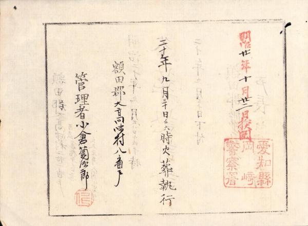 (火葬認許證)愛知県額田郡大高味村 -明治20年-