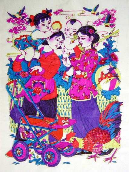 スッとつりあがった眼は現代中国版画を思わせる。子供の面倒は娘の仕事・・・という昔の風習を描いた年画。