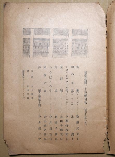 • 解説 背上下、口下部角小欠損 ヤケ 「装飾」アラン 桑原武夫 「神の手記」バビエ 辻潤 「ショペンハウエル傳」ワーレス 卜部哲次郎 「琵琶湖」太田千鶴夫 「荒涼」北村千秋 「らるぼとろす」今井貞吉 「除夜の客」青山虎之助 「夢殿(長篇第10回)」今井俊三 表紙:川上澄生 扉:青山二郎
