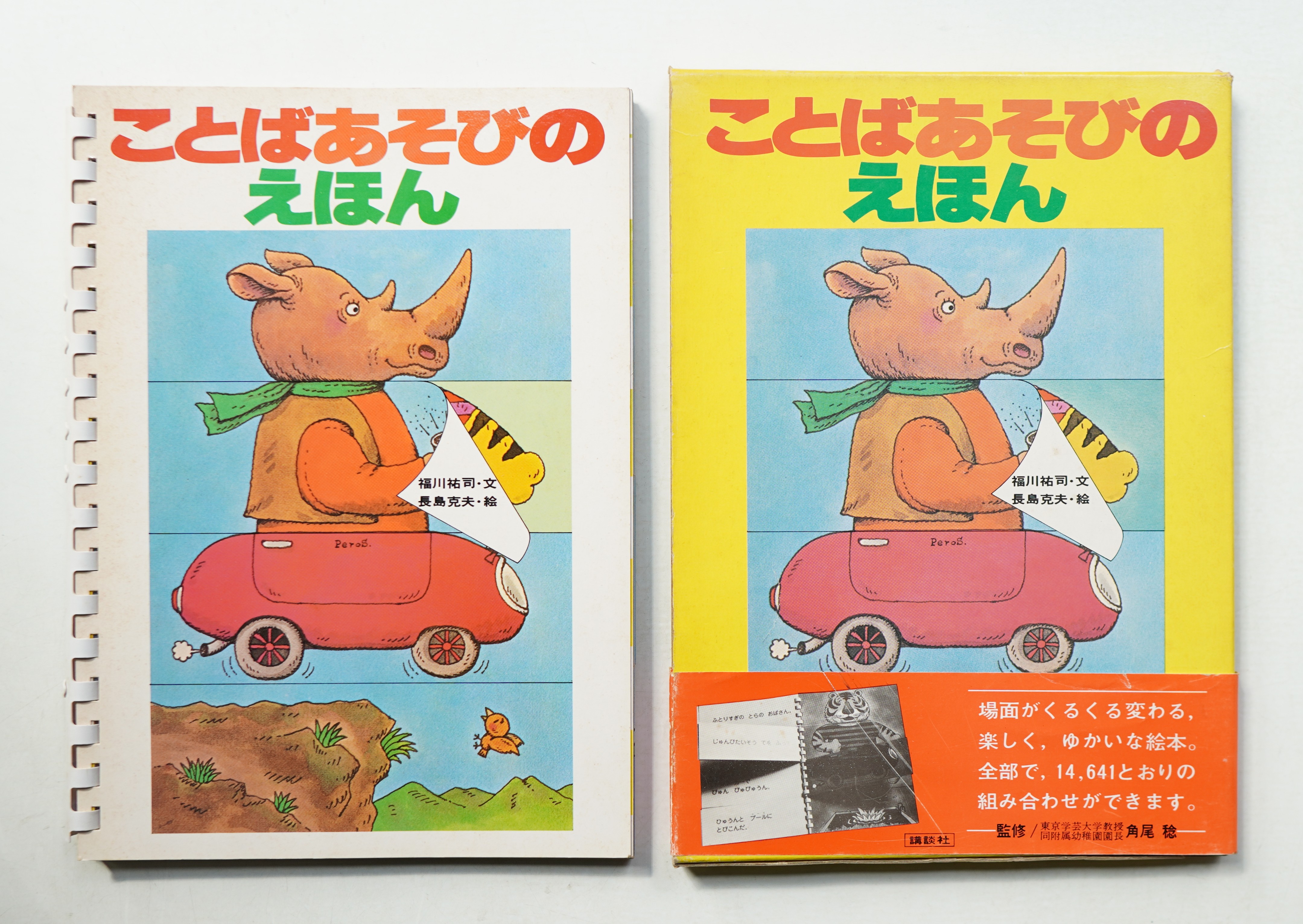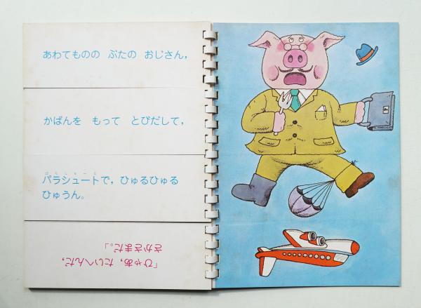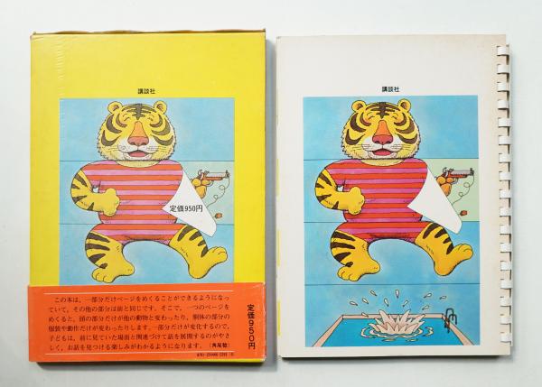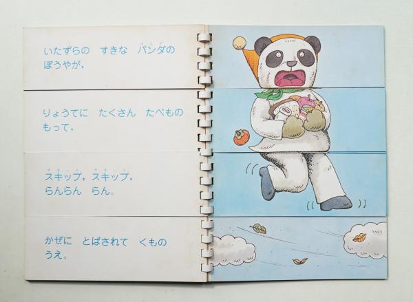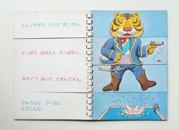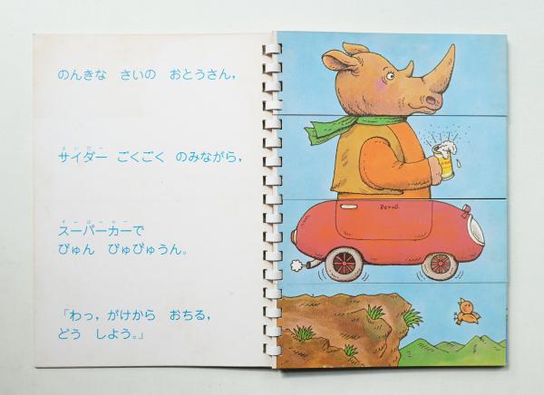 この本は,一部分だけページをめくることができるようになっていて,その他の部分は前と同じです。そこで,一つのページをめくると,頭の部分だけが他の動物と変わったり,胴体の部分の服装や動作だけが変わったりします。一部分だけが変化するので,子どもは,前に見ていた場面と関連づけて話を展開するのがやさしく,お話を見つける楽しみがわかるようになります。角尾稔