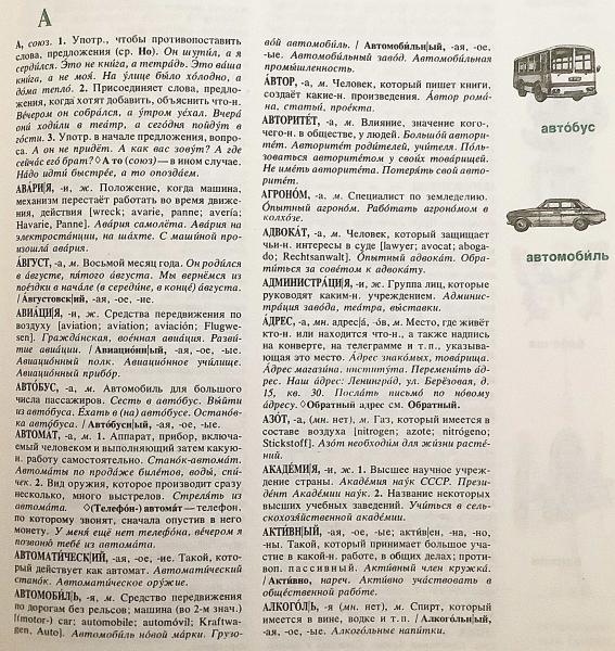 「автобус」「автомобиль」など具体的語には図解 (挿絵) が付されています。巻末にはロシア語の音声と文法の要約を収録。