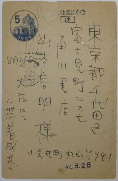 • 解説 昭和32年8月26日消印、角川書店山本容明宛、ペン書7行