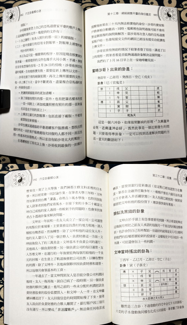 【目次】・(一)沈朝合・序(二)顧海雲・序(三)莊文正・序(四)黄耀宗・自序・第一章 六爻地支可用的各種化解物件・第二章 有關卦身・第三章 環環相扣法則・第四章 求孕和依卦象找醫生貴人・第五章 印籍女士找尋新工作・第六章 從問財運看出靈異事件・第七章 把糖灑到外地求職的卦例・第八章 陪爾看日出・第九章 選擇高中學府的三合一卦・第十章 家中掛件所帶來的問題・第十一章 地主公神龕的裝飾品・第十二章 婆嫁關係・第十三章 網絡銷售平臺的身●鑑定・第十四章 用水來傳達信息・第十五章 出租房子・第十六章 玄天上帝的象・第十七章 癌症的卦例・第十八章 鬼來●●・第十九章 爾目前沒工作・第二十章 婚姻的複合・第二十一章 投資藥房店鋪 ・第二十二章 未來丈夫的特徴・第二十三章 好兄弟來喝湯・第二十四章 讓陽光透入廚房・第二十五章 市政的選舉・第二十六章 遠在美國的訴訟・第二十七章 同性的愛情・第二十八章 醫生的戀情・第二十九章 祖先遺照對家運的影響・第三十章 運氣受到湖神的阻礙 ・第三十一章 佩戴佛牌・第三十二章 收債・第三十三章 卦象探索家中風水問題・第三十四章 車禍避免對方車主舉報・第三十五章 改變同性戀的傾向・第三十六章 祖墳風水・第三十七章 八字觸機起卦(一)看鬼怪・第三十八章 八字觸機起卦(二)觀友人工作與愛情近況・第三十九章 八字觸機起卦(三)來自北京的夫婦