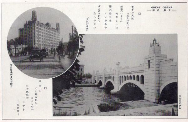戦前絵葉書 ○大阪 大阪名所 堂島川のダム 堂島ビルディング 大阪行進曲 春朝斎の狂歌 古写真 ○和本古書古文書