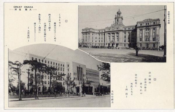 戦前絵葉書 ○大阪 大阪名所 大阪市庁舎の雄観 大阪府庁舎 大伴家持・西行の短歌 古写真 ○和本古書古文書