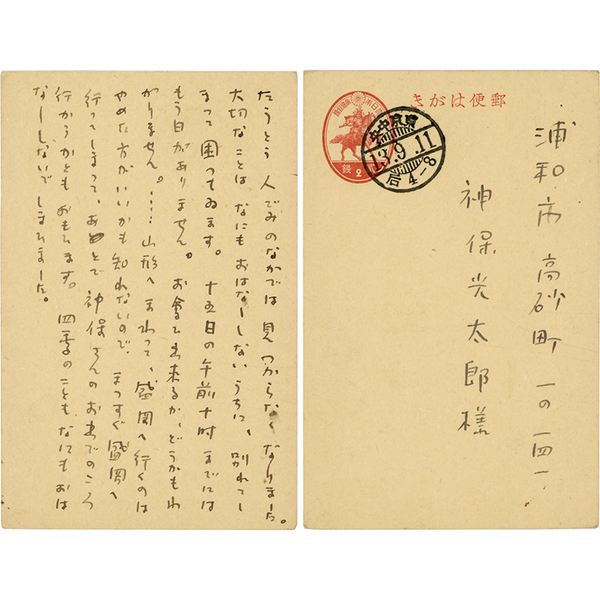 • 解説 神保光太郎宛 昭和13年9月11日(消印) ペン9行 無署名 「たうとう人ごみのなかでは見つからなくなりました。大切なことはなにもおはなししないうちに、別れてしまって困ってゐます。~」