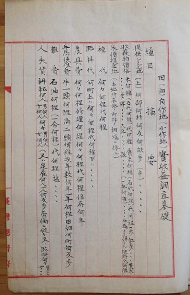 田畑自作地小作地実収益調査基礎 台湾総督府箋肉筆文書B5判4p 明治期