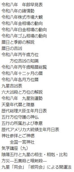 【目次】●令和八年 年齢早見表 ●令和八年の諸情勢 ●令和八年株式市場大観 ●令和八年金相場の動向 令●和八年白金相場の動向 ●令和八年ゴム相場の動向 ●暦日と季節の解説 ●暦日の吉凶 ●令和八年丙午歳方位 方位吉凶の知識 ●令和八年丙午歳略暦総覧 ●令和八年十二ヶ月の暦 ●令和八年各月方位暦 ●九星吉凶表 ●六大凶殺と方位の解説 ●令和八年九星別運勢 ●天皇年代暦と陵墓 ●歴代総理大臣生年月日表 ●五行方位守護の神仏 ●五行の所属および象意 ●歴代アメリカ大統領生年月日表 ●神社参拝とご神徳 ●全国一宮神社 ●気学講座(九) ●陰陽五行と九星の相生・相剋・比和 方災―五黄殺と暗剣殺一 ●九星「同会」「被同会」 による開運法