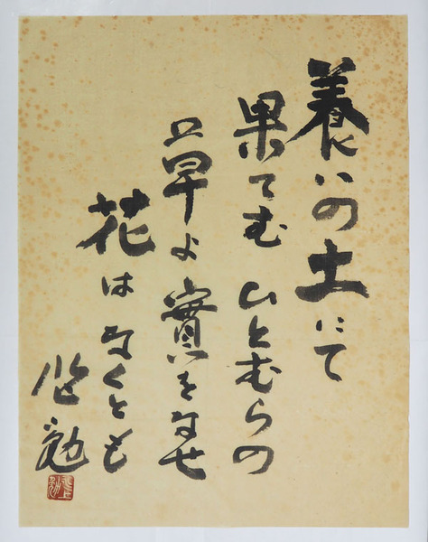 • 解説 『養いの土にて果てむひとむらの 草よ實をなせ花はなくとも』 毛筆書落款入 シミ有 432×328ミリ 【状態に関する注意】けやき書店の掲載品は全て、状態に関わらず「中古品(並)」と表示されています。「日本の古本屋」は6段階の「状態」表示が必須となりましたが、当店の扱う商品の特質上、状態の簡易な区分けは適切ではない(不可能な)ため、状態欄の「中古品(並)」という表現は考慮にいれないで下さい。痛みなどの瑕疵につきましては、解説欄等をご参考にして下さい。状態表記の無いものは特に問題無く良好とお考え下さい。: