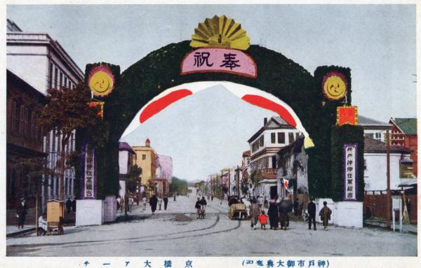 • 解説 N25111159〇戦前絵葉書 ○神戸市御大典奉祝 京橋大アーチ・神戸沖仲仕業組合の看板 古写真 カラー ○和本古書古文書