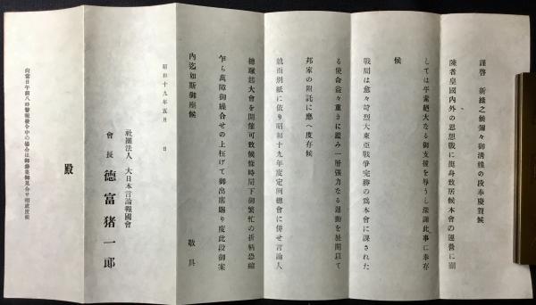 • 解説 10x19cm 挨拶状2点共 会長~徳冨猪一郎 会場)大東亜会館