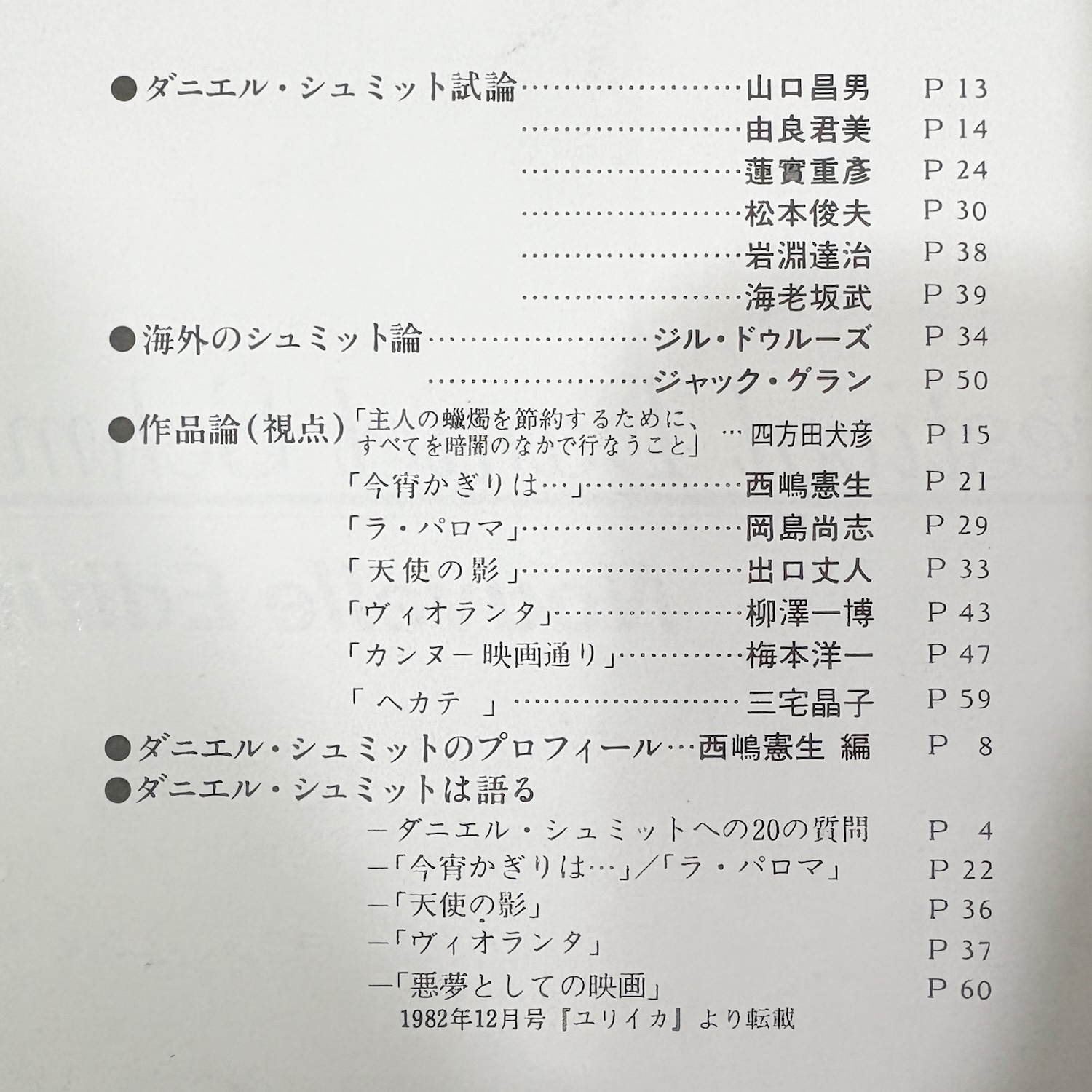 山口昌男, 由良君美, 蓮賓重彥, 松本俊夫, 岩淵達治, 海老坂武, ジル・ドウルーズ, ジャック・グラン, 四方田犬彦, 西嶋憲生, 岡島尚志, 出口丈人, 柳澤一博, 梅本洋一, 三宅晶子, ダニエル・シュミットへの20の質問