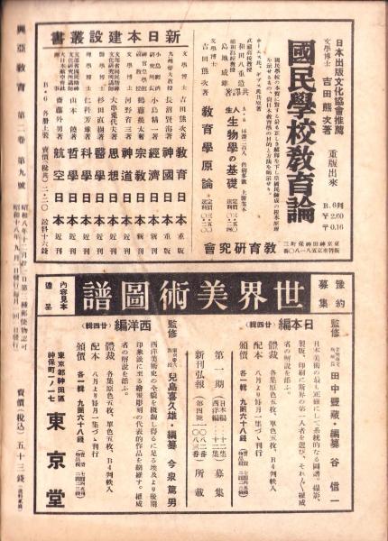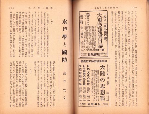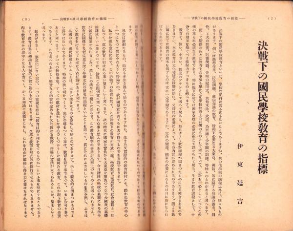 • 著者 〈決戦下の国民学校教育の指標 8頁〉〈師範教育の課題 9頁〉〈自主的一体感の興亜教育 9頁〉〈森銑三「維新史挿話 岡鹿門の上京」7頁〉〈塾教育と世界観陶冶 8頁〉〈水戸学と国防 9頁〉〈伝統と青年 11頁〉