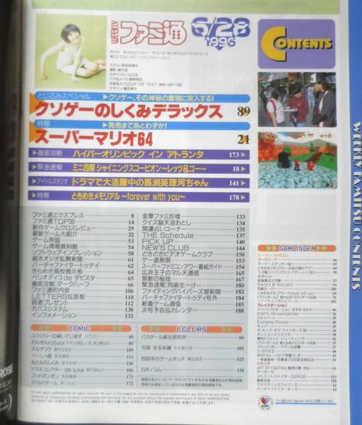 とじ込みスペシャル/クソゲーのしくみデラックス 特報/スーパーマリオ64 徹底攻略/ハイパーオリンピックインアトランタ 緊急速報/ミニ四駆シャイニングスコーピオン~レッツ&ゴー~ アイドルスタジオ/ドラマで大活躍中の馬渕英理河ちゃん 特報/ときめきメモリアル~forever with you~ 他