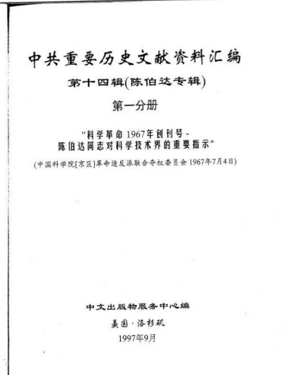 volume1. (1) 《科学革命》1967年创刊号 -陈伯达同志对科学技术界的重要指示 ; (2) 陈伯达学习毛主席四篇哲学著作解答报告