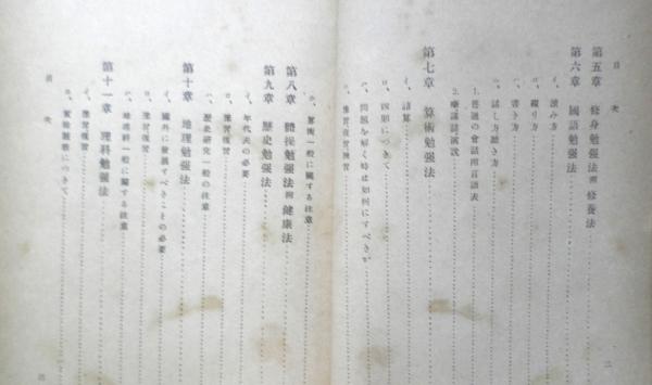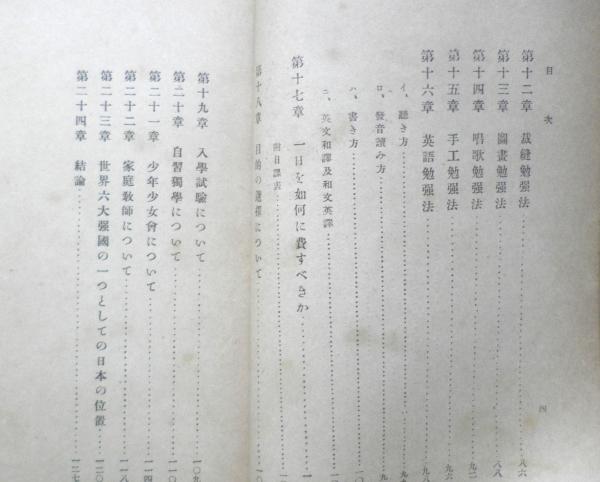 日本少年少女の覚悟/人間の力と進取の気象/優等生となるに大切な事/辞書(字引)の使用につきて/修身/国語/算術/体操/歴史/地理/理科/裁縫/図画/唱歌/手工/英語/一日を如何に費すべきか/目的の選択について/入学試験について/少年少女会について/家庭教師について/世界六大強国の一つとしての日本の位置/結論
