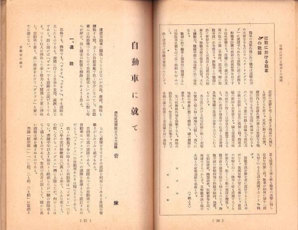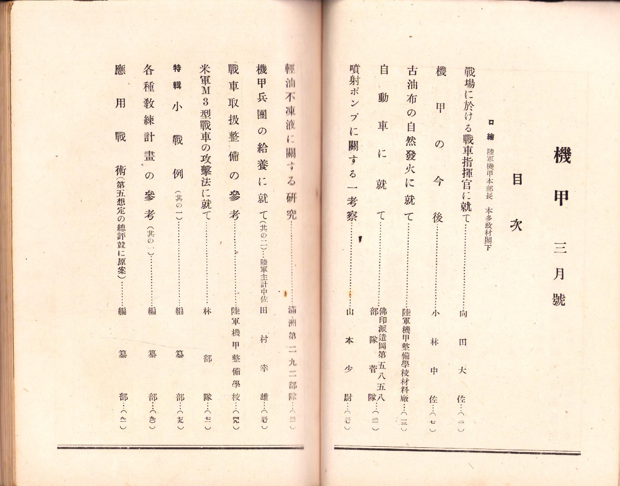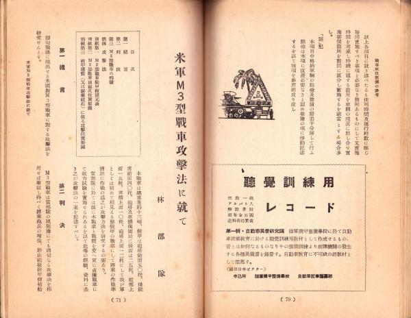 • 著者 〈古油布の自然発火に就て 7頁〉〈自動車に就て 6頁〉〈軽油不凍液に関する研究 6頁〉〈機甲兵団の給養に就て 11頁〉〈戦車取扱整備の参考 21頁〉〈米軍M3型戦車の攻撃法に就て 7頁〉
