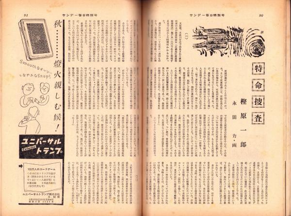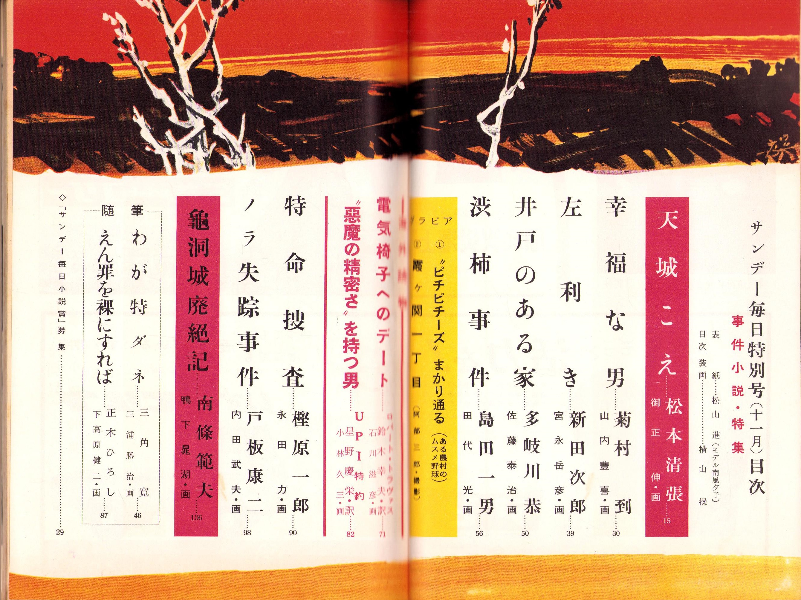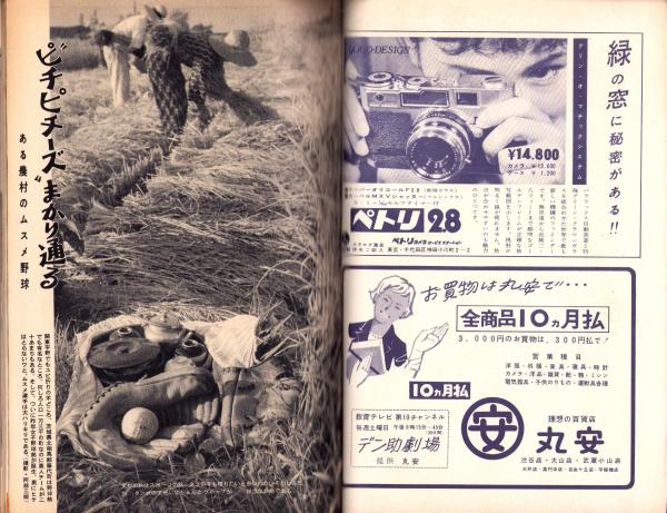 • 著者 〈三角寛「わが特ダネ -浜口総理の遺稿スクープ-」3頁〉〈‘ピチピチーズ’まかり通る -ある農村のムスメ野球- モノクロ7頁〉、松本清張、菊村到、新田次郎、多岐川恭、島田一男、樫原一郎、戸板康二、南條範夫、正木ひろし