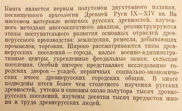ソ連科学院による20巻本の大型シリーズの一冊で、古代ルーシ (9-14世紀) の物質文化を総合的に扱う考古学的研究書。