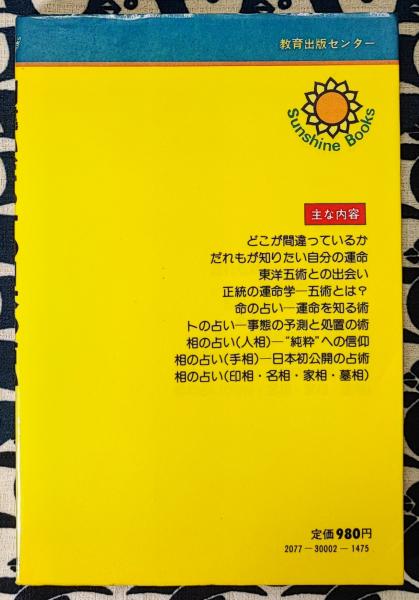 もくじ 【第1章】間違いだらけの日本の占い 【第2章】頼る人間・頼られる占い [1]だれもが知りたい自分の運命 [2]命の占いでわかる事象 [3]どうなる?これからの占い 【第3章】東洋五術との出会い [1]占いのジャングルの中で [2]正統占術日本上陸の裏に 【第4章】正統の運命学-五術とは? [1]五術はどうして生まれたか [2]人間の英知-五術の体系 [3]五術には四つの要素がある 【第5章】命の占い-運命を知る術 [1]占いの根本-「命」 [2]だれも"命"から逃れられない [3]命で何を占うか [4]人は生まれ、死んでいく [5]命の占いの実例 ・推命術の紫薇斗数命理盤 ・四柱推命の鑑定実例 ・中国の正式鑑定書 【第6章】トの占い-事態の予測と処置の術 [1]トで何を占うか [2]「ト」の三つの占い方 [3]「奇門遁甲」の秘伝 ・だれも知らなかった「奇門遁甲」 ・従来の占いでは政局や地震は予測できない ・断易・六壬・遁甲の占い方 【第7章】相の占い(人相)-"純粋"への信仰 [1]「相」の五つの占い方 [2]中国五術の「相」の考え方 ・"貧相"も高貴・福徳の相 ・"純粋性"こそ吉相の基 ・"美醜"は問題ではない [3]大吉相とは? ・重視される"目つき" ・面相の十二タイプ-十二天将 ・日本流人相占いの矛盾 ・純度順による四つの分類法 ・美容整形では運は開けない ・ありのままに生きよ 【第8章】相の占い(手相)-日本初公開の占術 [1]なぜ西洋流がはやるのか [2]日の目を見なかった正統手相術 ・欠陥が多かった「麻衣相法」 ・「神相鉄関刀」と「金面玉掌」 ・占い師・桜井大路と踊り子・三益愛子 [3]「玉掌相術」はここが違う ・手型の考え方 ・西洋の「丘」と中国の「位」 ・掌線の見方では? ・左右どちらの手を見るか ・玉掌流は明確に答える [4]乙奇線による見方 [5]丙奇線による見方 [6]丁奇線による見方 【第9章】相の占い(印相・名相・家相・墓相) [1]印相と運勢 [2]名相・家相・墓相と運勢 [3]正しい墓相の見方 ・墓相学とは? ・巒頭とは? ・理気とは? ・門向牌向の吉凶作用 ・天地盤で見る方位の吉凶 ・お墓の五常とその吉凶 ・形勢とお墓 ・吉凶作用の及ぶ範囲